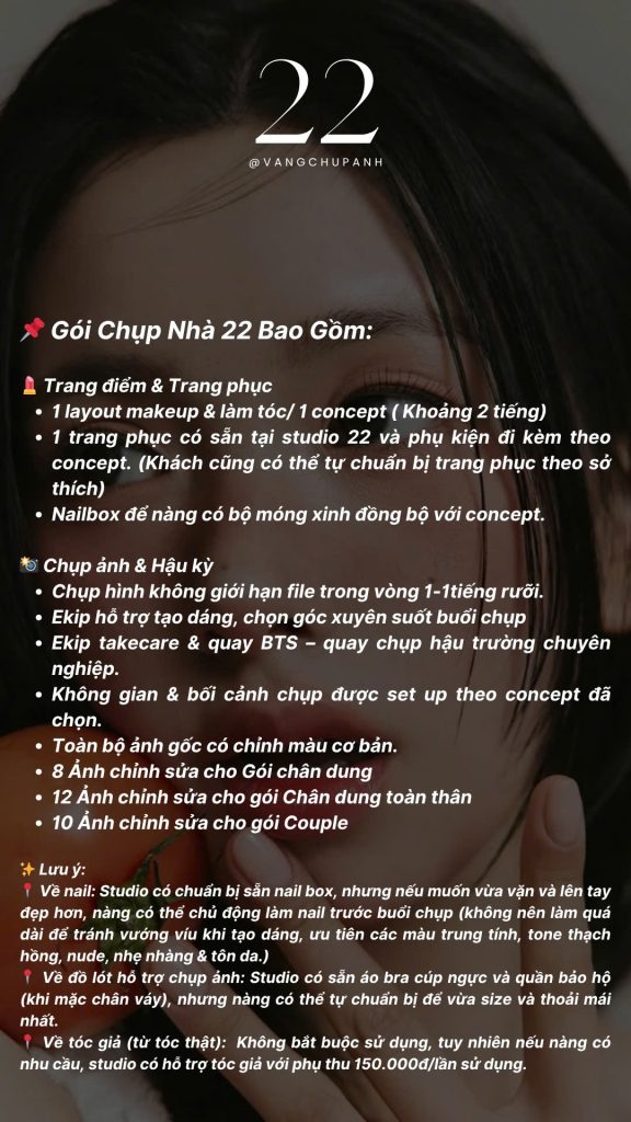 - Gói chưa bao gồm hoa tươi, nếu chọn concept có sử dụng hoa. 22 sẽ báo mức phụ thu cụ thể trước khi xác nhận lịch.